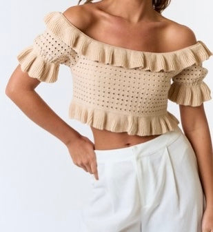 Ruffled pointelle off shoulder sweater top